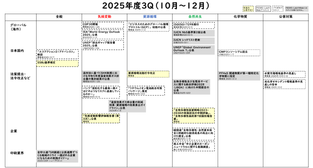 企業の生物多様性への取組みに関する調査結果が2つ公表されています。経団連の「企業の生物多様性への取組に関する(2024年度調査)アンケート調査」と商工中金の「中小企業のカーボンニュートラルに関する意識調査」です。どちらも毎年行われています。企業が実施している取組みに着目すると、経団連調査では、昆明・モントリオール生物多様性枠組み(GBF)のターゲットと関連付けて整理しています。最多は「ターゲット8:気候変動対策(含、NbS/EbA)」で、次いで「ターゲット15:ビジネスの影響評価・開示」、「ターゲット3:(30 by 30)/保護地域及びOECM」です。産業部門「パルプ・印刷」はGBFに貢献する取組みのある企業の割合が最も多くなっています。ただし、これらの結果は昨年度と同じです。昨年度の報告では、GBFの各ターゲットに関連する定量的目標の設定について具体的な目標の事例が紹介されていて、「プラスチック削減/リサイクル」、「廃棄物削減/リサイクル」が上位でしたが、今年度の報告には紹介はありません。一方、商工中金調査は、設備投資動向調査の付随調査として行われています。「生物多様性・自然資本保護についての方策・検討状況」で「なんらかの方策を実施・検討」と回答した割合が業種別で最も多いのは「印刷」で、65.5%が実施・検討と回答しています。この具体的に実施している方策は、アンケートであらかじめ準備された選択肢かもしれませんが、業務プロセスの改善を通じた環境負荷の低減、自社の環境に関する実績(水使用量・廃棄物等)の測定、環境負荷低減を考慮した原材料等の調達、自社の環境に関する削減目標(水使用量・廃棄物等)の設定、環境配慮型製品・サービスの開発です。これらは日常業務として当り前に行っていることで、生物多様性・自然資本保護とは無関係と考えがちですが、TNFDのガイドラインを踏まえると的外れではありません。