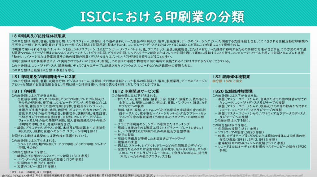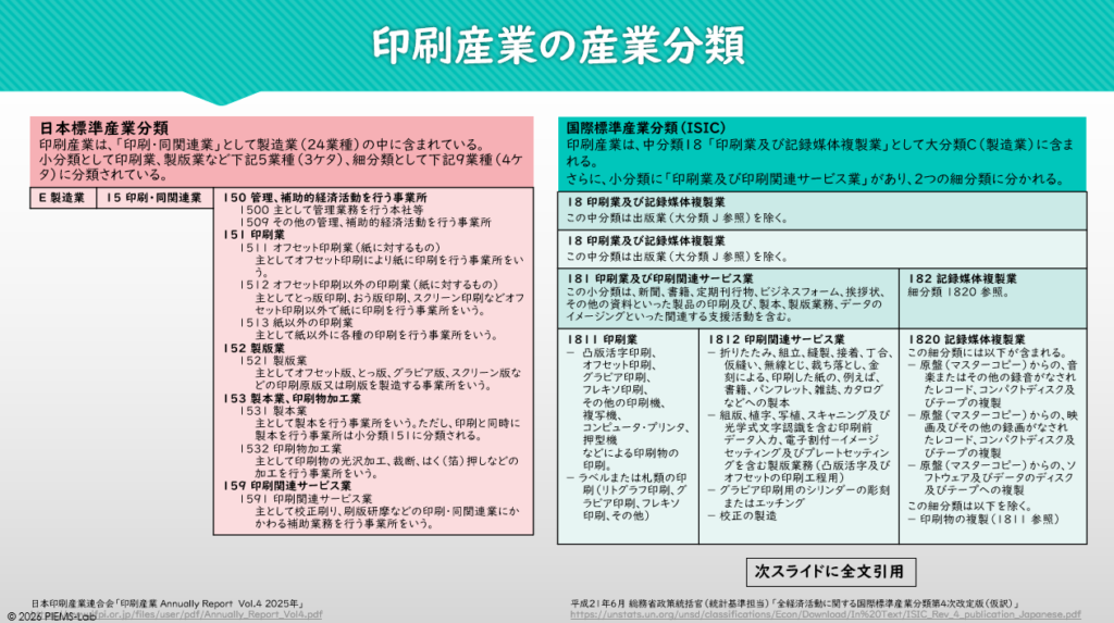 印刷産業は日本国内では日本標準産業分類で「E 製造業」の中の「印刷・同関連業」に分類されています。一方、LEPAアプローチで使用される評価ツールでは国際標準産業分類(ISIC)が使用されています。印刷産業は「大分類C(製造業)」の中の中分類「18 印刷業及び記録媒体複製業」に分類され、さらに、小分類では「181 印刷業及び印刷関連サービス業」と「182 記録媒体複製業」に分かれます。小分類「181 印刷業及び印刷関連サービス業」は、「1811 印刷業」と「1812 印刷関連サービス業」の2つの細分類に分かれます。「1811 印刷業」にはオフセット印刷業、グラビア印刷業、さらにコンピューター・プリンタを使用した印刷も含まれています。「1812 印刷関連サービス業」には、丁合、製本などの後工程、データ入力、電子割付などの前工程、さらにグラビア刷版が含まれています。