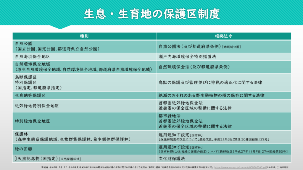 一方で、「生物多様性国家戦略2023-2030」には、法律や制度などに基づく生息・生育地の保護地域が記載されています。