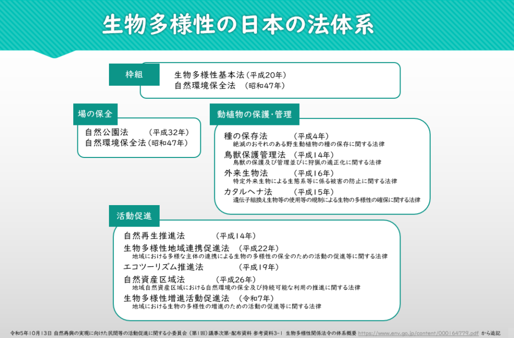 環境省は、生物多様性の日本の法体系を以下のように整理しています。