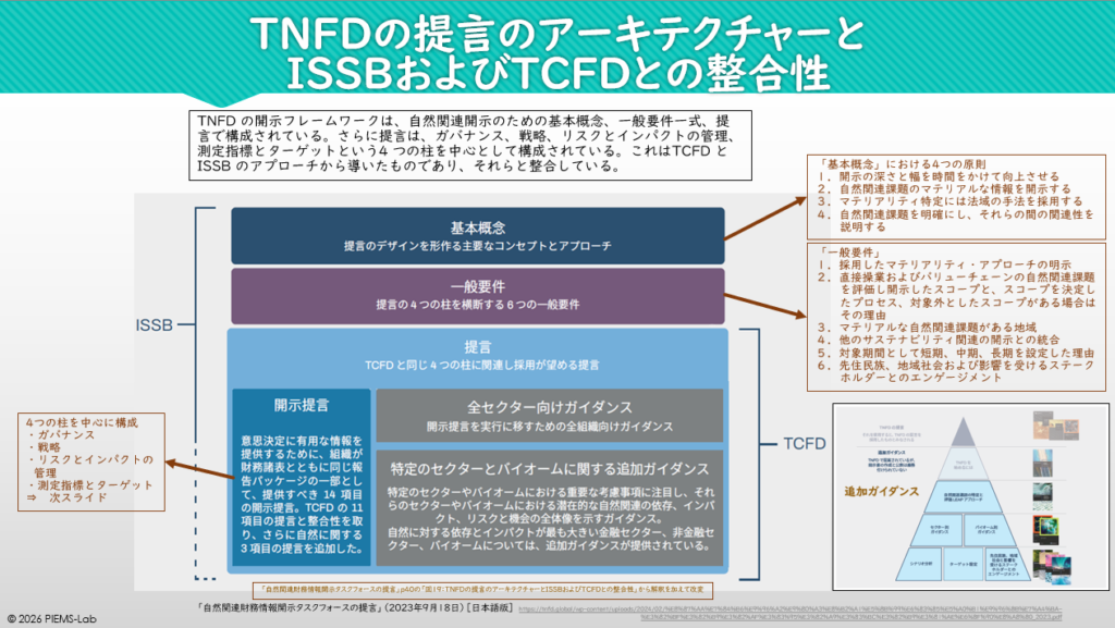 基本概念は、①時間をかけて開示内容を充実させること、②自然関連課題(依存、インパクト、リスク、機会)のマテリアルな情報を開示すること、③ISSBの手法を推奨するものの各法域の手法に従って開示すること、④明確にした自然関連課題の間の関連性を明確にすることです。