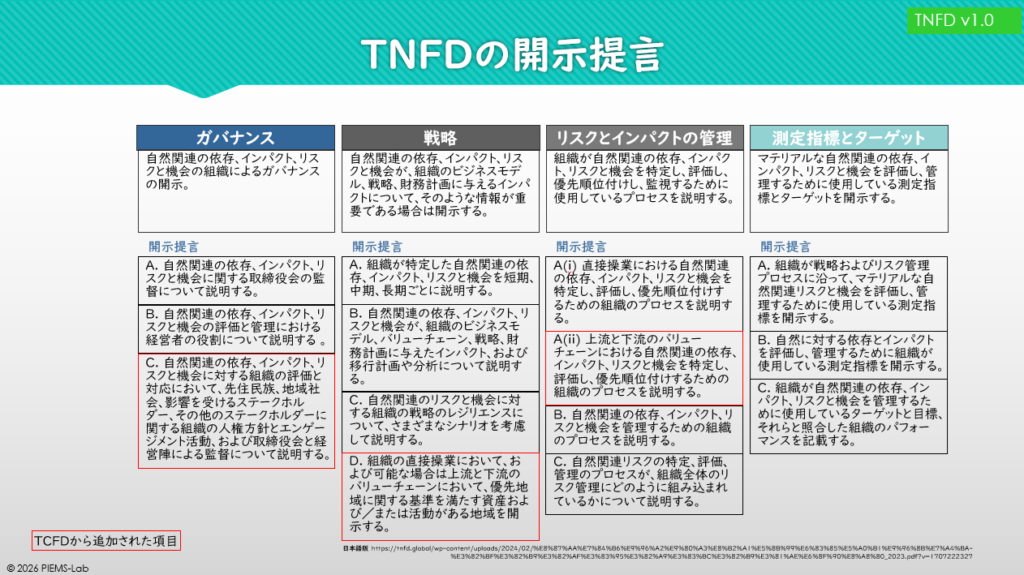 このフレームワークは、TCFDが2017年に公表した気候変動関連情報開示のフレームワークと同じ4つの柱で構成されていますが、異なる点があります。