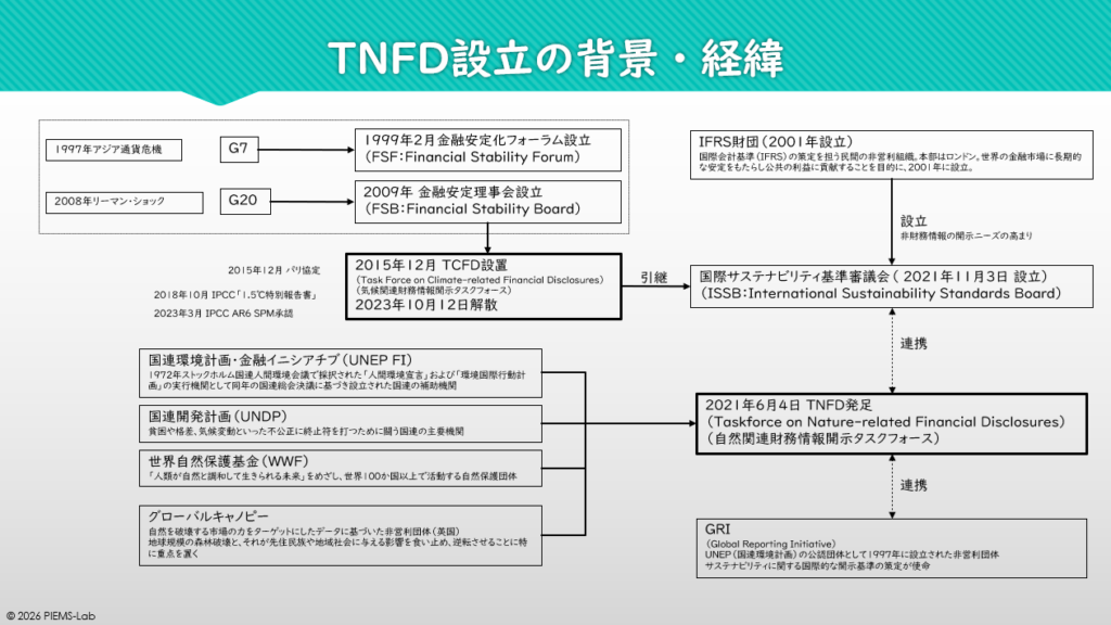 TNFDは、2019年1月の世界経済フォーラム年次総会(ダボス会議)において着想され、2020年から国連環境計画・金融イニシアチブ(UNEP FI)、国連開発計画(UNDP)、世界自然保護基金(WWF)、英NGOグローバルキャノピーによって準備が進められ、2021年6月4日に発足しました。2023年9月18日に「TNFD開示のための提言書」を公表し、このなかでTCFD、ISSB、GRIおよびGBFのゴール・ターゲットと整合させた自然情報開示のフレームワーク「TNFDフレームワーク」を提示しました。