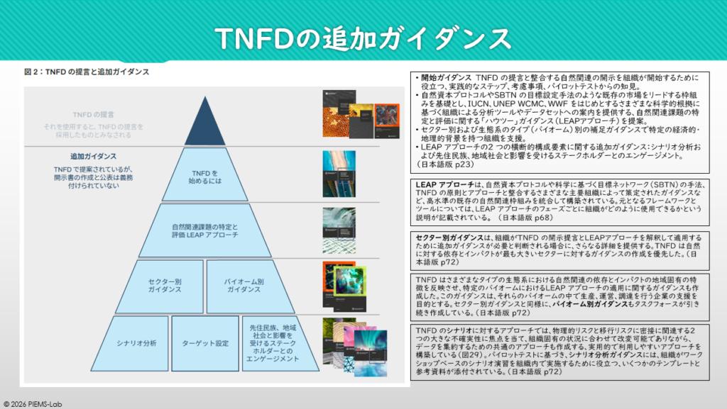 TNFDは、「マテリアルな自然関連課題を開示するには、組織が自然関連課題を特定し、評価する知識と能力を有することが前提である」ことから、組織の知識と能力を向上させるために以下のような追加ガイダンスを公表しています。