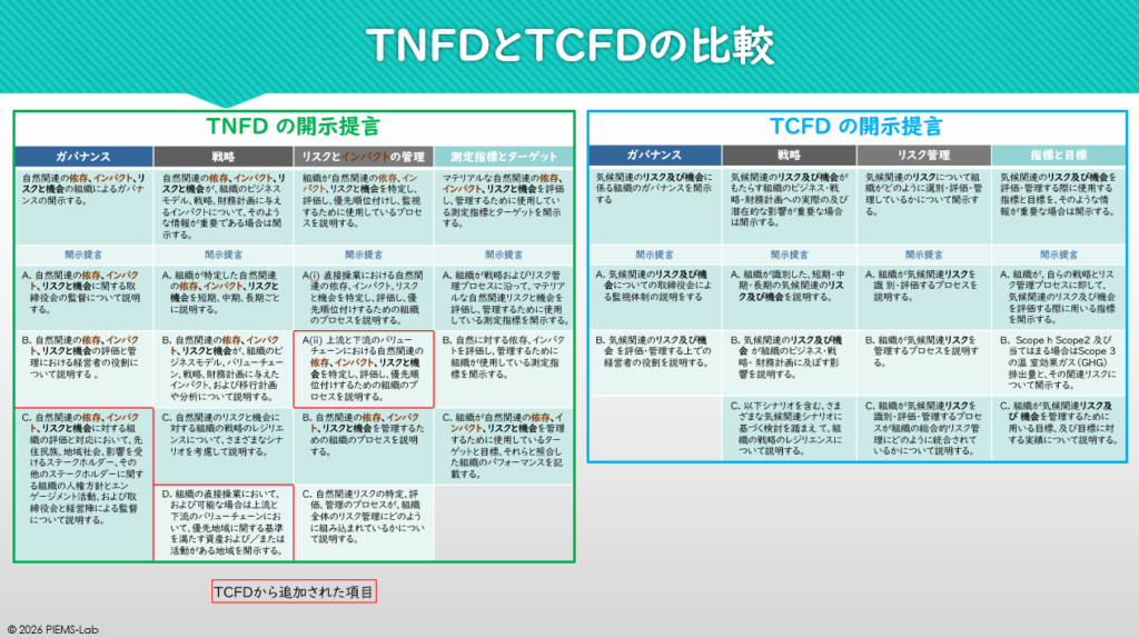 ふたつめは、管理の対象が違う点です。TCFDフレームワークでは気候関連の「リスクと機会」であるのに対して、TNFDフレームワークでは依存とインパクトが加わり、「依存、インパクトリスクと機会」となっている点です。