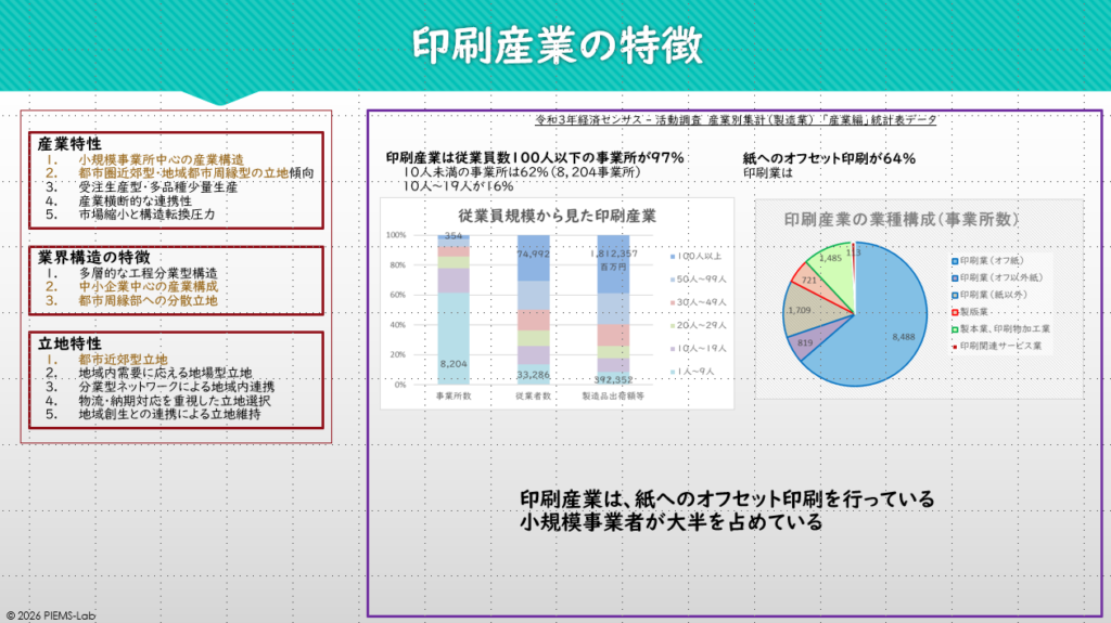 以上から、印刷産業の代表的な事業者は、都市部に立地した小規模な工場で紙へのオフセット印刷を行っていると想定できます。ここでは、この視点で検討を進めます。