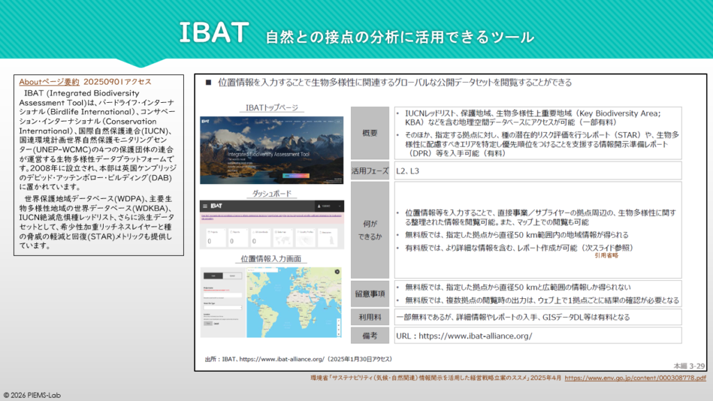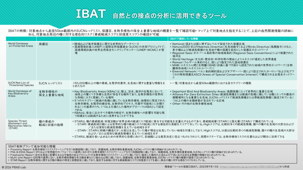 IBAT (Integrated Biodiversity Assessment Tool)は、バードライフ・インターナショナル(Birdlife International)、コンサベーション・インターナショナル(Conservation International)、国際自然保護連合(IUCN)、国連環境計画世界自然保護モニタリングセンター(UNEP-WCMC)の4つの保護団体の連合が運営する生物多様性データプラットフォームです。2008年に設立され、本部は英国ケンブリッジに置かれています。IUCN絶滅危惧種レッドリスト、世界保護地域データベース(WDPA)および主要生物多様性地域の世界データベース(WDKBA)のデータ、さらにこれらから派生するデータとして種の脅威の軽減と回復(STAR)指標も提供しています。