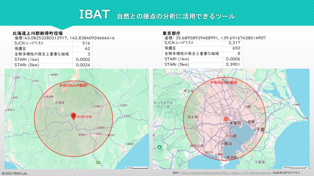 IBATの探索結果を見ると、IUCNレッドリストの種の数、保護区および生物多様性の保全上重要な地域の数は、いずれも東京都庁の方が多くなっています。東京都庁の方が自然豊かな場所に位置していると判断できる結果となっています。これは、調査した範囲が50km以内であること原因があると考えられます。東京都庁の場合、50km以内には関東平野全体、東京湾、奥多摩・丹沢の山地、千葉県の手賀沼・印旛沼などの多様な生態系が含まれています。一方、新得町役場は富良野市や帯広市が含まれるものの日高山脈や大雪山国立公園などの山地です。このように50kmの範囲に含まれる生態系の多様さが結果に表れていると考えられます。IBATでは50km以下の診断結果も得られますが有料です。したがって、無料で調査できる範囲ではIBATは有用なツールではないと考えます。