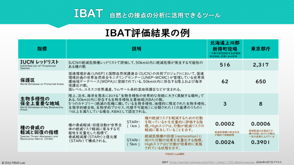 また、新得町役場は十勝川源流原生自然環境保全地域や大雪山国立公園に近く、自然環境保全が進んでいる地域であるにも関わらず、役場のSTARtおよびSTARrはそれぞれ0.0002、0.0024で、「絶滅危惧種の保全状況が極めて初期段階」と解釈できる数値を示しています。この点からも、IBATを使用して日本国内の地点で探索することに疑問があります。なお、STARt(Species Threat Abatement and Restoration target)は、種の絶滅リスクを軽減するための行動を取っているかを定量的に評価する指標で、Highスコアほど行動が絶滅リスクの軽減に寄与していることを示します。STARr(Species Threat Abatement and Restoration restoration target)は、絶滅危惧種の回復(restoration)に向けた行動の効果を定量化する指標で、Highスコアほど行動が効果的に実施されている状態を示します。