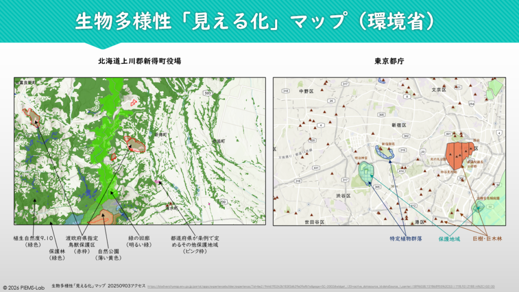 日本国内に限れば、自然環境保全上の重要な地域の把握には、環境省が公開している「生物多様性マップ」が有用です。これは、保護地域、自然共生サイト、生物多様性保全上効果的な場所等を地図上で確認できるツールで、2025年、4月21日から施行運用を開始しています。日本国内の任意の地点で、近傍の自然環境保全地域、自然公園、鳥獣保護区、特定植物群落などが図示されます。さらに、市区町村レベルで、地域生物多様性戦略を策定しているかも確認することができます。